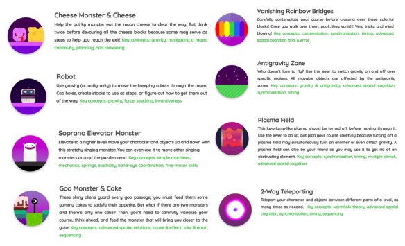 Navigate through seven unique-themed planets, each focusing on a different set of skills and puzzle elements. Throughout, youâre encouraged to experiment. Youâll learn through trial and error to combine elements, as well as how to build on successive lessons to strengthen creative thinking, logic, problem solving, spatial cognition, and memory. Look for the key and exit gate. Try to visualize your route. Use and combine objects to clear a path, get the key, and move to the exit. Trapped? No problem. Just tap the reset button at the top right of the screen and try again. The app offers unlimited, penalty-free retries, and no time limits. This along with the option to toggle off the background music contribute to it being special needs friendly.