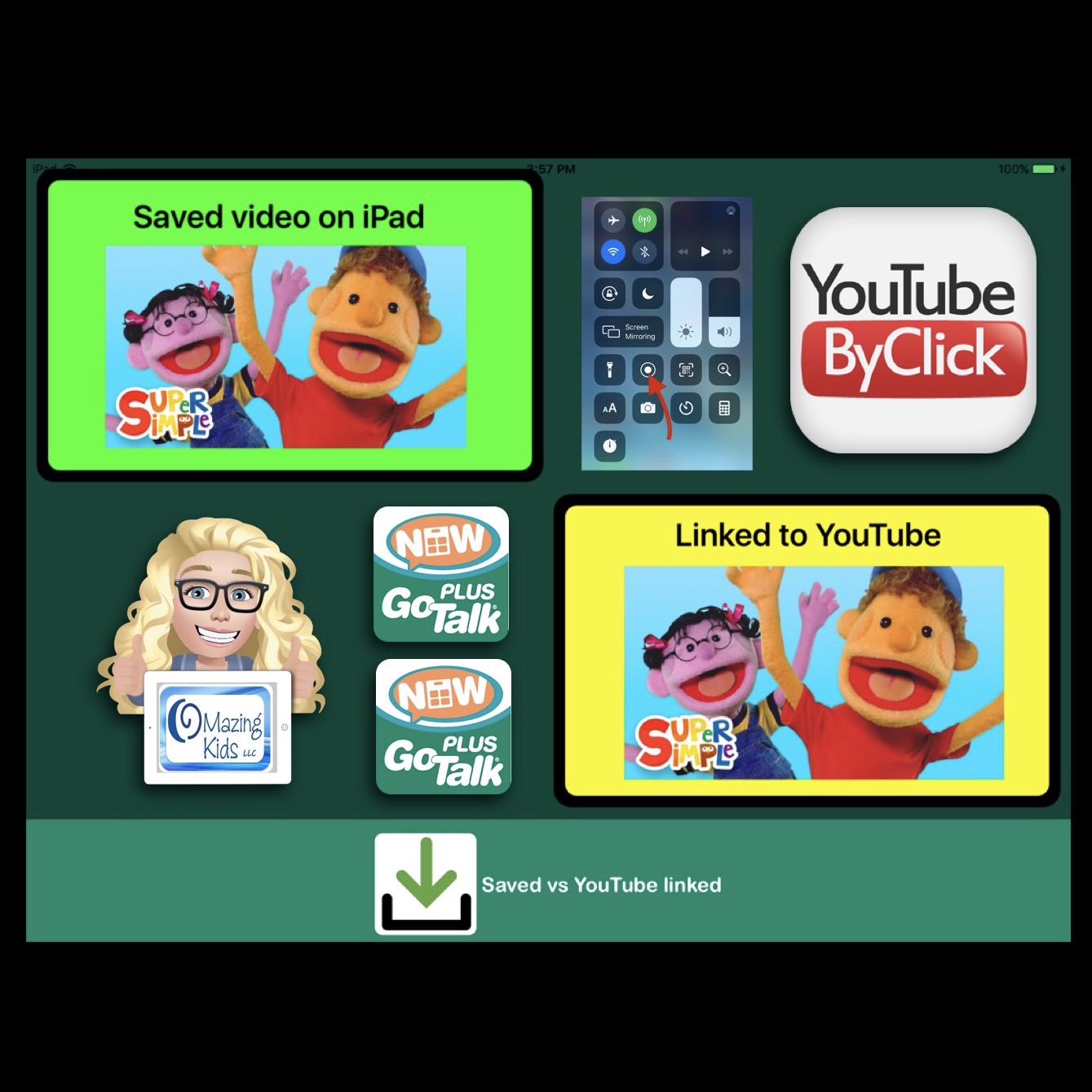 I used the Screen Recording feature in the iPhone Control Center to take a screencast video while I was playing the YouTube video to save it. Then I edited the video to crop off a little at the beginning and end. My iPad Pro running iOS 10.3.3 doesn’t have a Screen Recording option in the Control Center. My iPad Mini 2 running iOS 12.4.8 could record but didn’t have sound. I was able to do this via my iPhone 11 running iOS 13.5.1 and then used AirDrop to send it to my iPad Pro to use in the GoTalk Now Plus app. My guess is an iPad running at least iOS 13 would have sound in the screen recording but have no way to know for sure 🤷🏼♀️