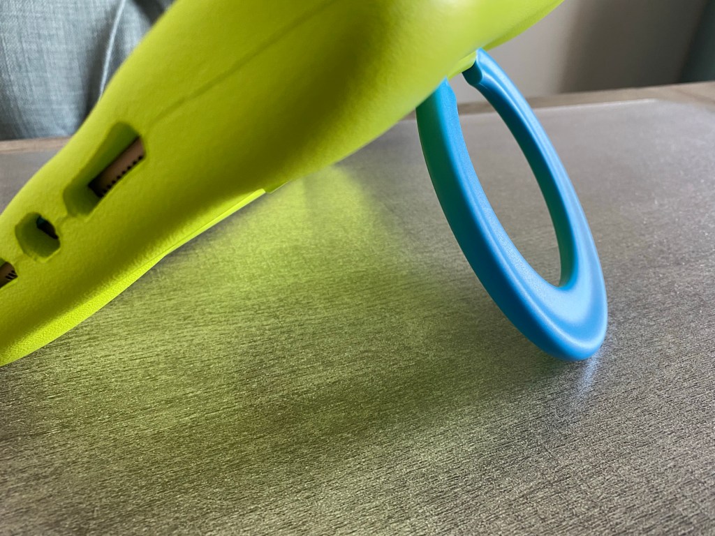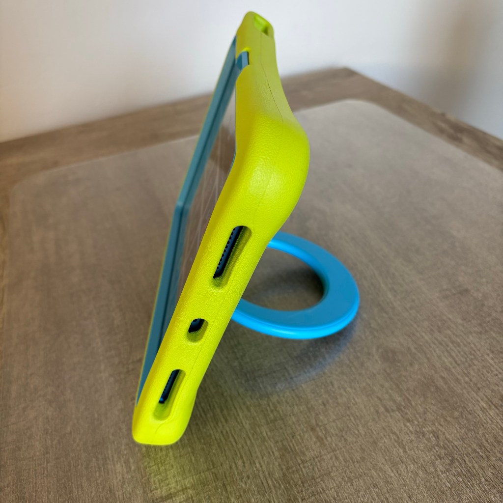 * Built-in stand that can rotate 360 degrees so it can accommodate AAC apps in Portrait and Landscape orientation. The stand lays flush when pushed in so the case doesn’t wobble when it’s used flat on the table / desk.