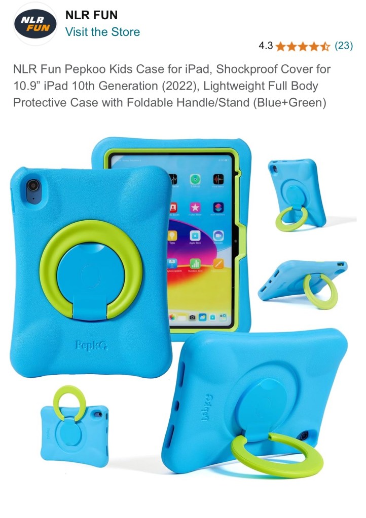 NLR Fun Pepkoo Kids Case for iPad, Shockproof Cover for 10.9” iPad 10th Generation (2022), Lightweight Full Body Protective Case with Foldable Handle/Stand (Blue+Green): https://a.co/d/9KEe4YS (also available in Green-Blue, Grey-Black, Mint-Orange, and Pink-Blue. Price: $20.99 (prices and availability may vary outside of the USA)