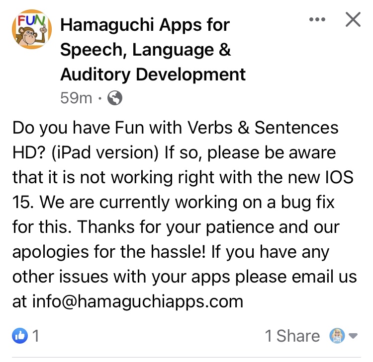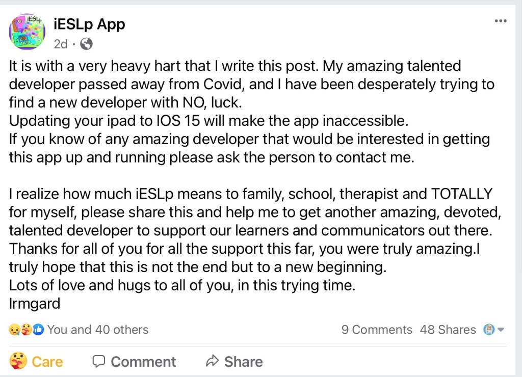 Why am I concerned? As I’ve been working on an update for my large app resource guide I’ve run across numerous apps that have disappeared from the App Store. I haven’t seen this many apps disappear in mass like this since iOS 11 rolled out. That particular iOS caused problems with several AAC and therapy apps. Of course I have no way to know what will happen with iOS 15 but am seeing enough red flags to be concerned and to post about it. It’s heartbreaking when AAC users lose their voice when a new iOS rolls out and causes glitches. Now is the time to prevent that from happening.