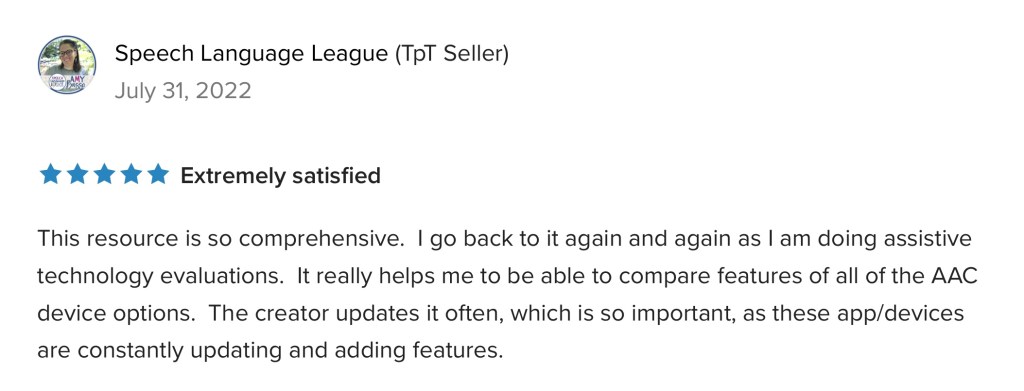 Looking for resources to compare features in a wide variety of AAC apps? I added a bundle on TPT includes all three of my iOS AAC feature matching resources at a discounted price compared to purchasing them individually (saves about 10%). If you are looking to purchase resources for several staff / team members, take a look at the Multiple Licenses discount (saves 20%): https://www.teacherspayteachers.com/Product/AAC-Feature-Matching-Resource-Bundle-7849416