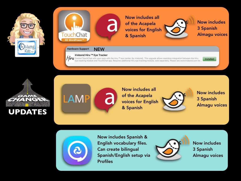 TouchChat with WordPower: All of the English & Spanish high quality Acapela voices that used to require in-app purchases are now included. This is a huge game changer since schools, state run facilities and many funding sources had difficulty with the in-app purchasing process. It was especially problematic for entities using a MDM (mobile device management) system.