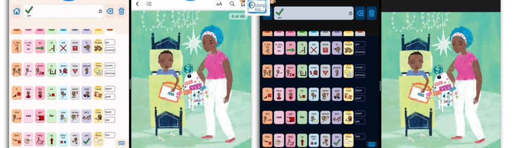 AAC apps that offer full support of Split View / Split Screen offer the opportunity for greater accessibility and access than AAC apps that don’t support this. Why does this matter? There are many adult AAC users who multitask with their tech. But this isn’t just a feature that benefits adults. Here is an example of how I’m using the Proloquo app by AssistiveWare alongside the Apple Books app with “A Day With No Words” by Tiffany Hammond (Fidgets and Fries). I also own a hardcover copy of this same book and loved it so much that I decided to purchase the ebook version in Apple Books to offer another means of access and use (both alongside AAC and separately).