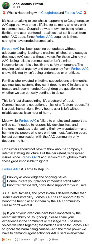Looking for in-depth AAC feature matching resources? See this blog post: https://bit.ly/5aacFeatureMatchingResources. That post also includes videos comparing the best AAC apps on various devices on various platforms.