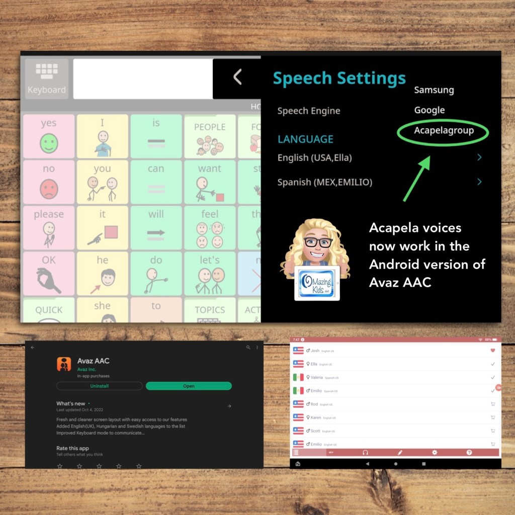 The update for the Android version of Avaz on 10/4/22 added access to setting Acapela as a Speech Engine. This allows you to use any Acapela voices that you have purchased and installed.