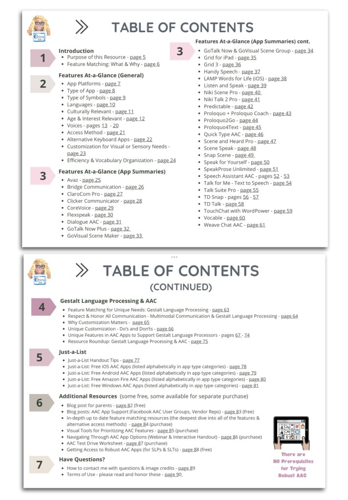 This 90 page PDF resource was inspired by the numerous requests that I’ve received for simple “at a glance” info about features in AAC apps and single page handouts that could be used with parents, caregivers and anyone involved in the AAC decision making process.