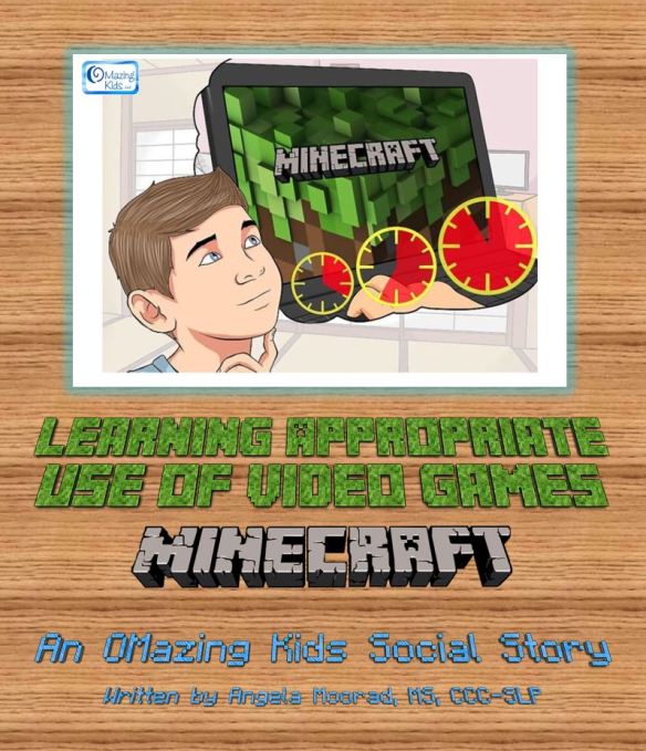 Over my 27+ career as a SLP I’ve worked with several kids & teens with Autism, ADHD and other special needs who became obsessed with a particular video game. The typical culprits are Pokemon, Mario, Angry Birds & Minecraft. When played in moderation video games can provide a stress relief outlet for kids with special needs. But for some kids it can become an obsession or even an addiction. When a kid or teen only wants to play, think about or talk about a particular game, then you know you have a problem. Well Minecraft Steve and his pals have attempted to take over another one of my patients. Minecraft has messed with the wrong speechie. This particular child and his family hold a very special place in my heart so I was determined to help. Since this is a fairly common issue, I was shocked that I could not find any social stories online regarding appropriate use of video games. So I wrote one today using the Social Stories Creator for Educators app by Touch Autism. This particular child has an amazing knowledge of anatomy and chemistry well beyond what would be typically expected for his age so I used a few anatomy and brain chemistry terms to tie into that high interest area and help him see for himself why unlimited game play would not be a healthy choice for his brain. I even recorded voice overs for each page. I then sent it to myself in an e-mail both as a printable PDF and as a story that can be used within the app. Super excited that the voice overs were included when I imported the story onto my other iPad and that they could be edited on that second device (so anyone importing the story that I created will be able to edit the pictures, text and voice overs to fit that child’s unique needs).