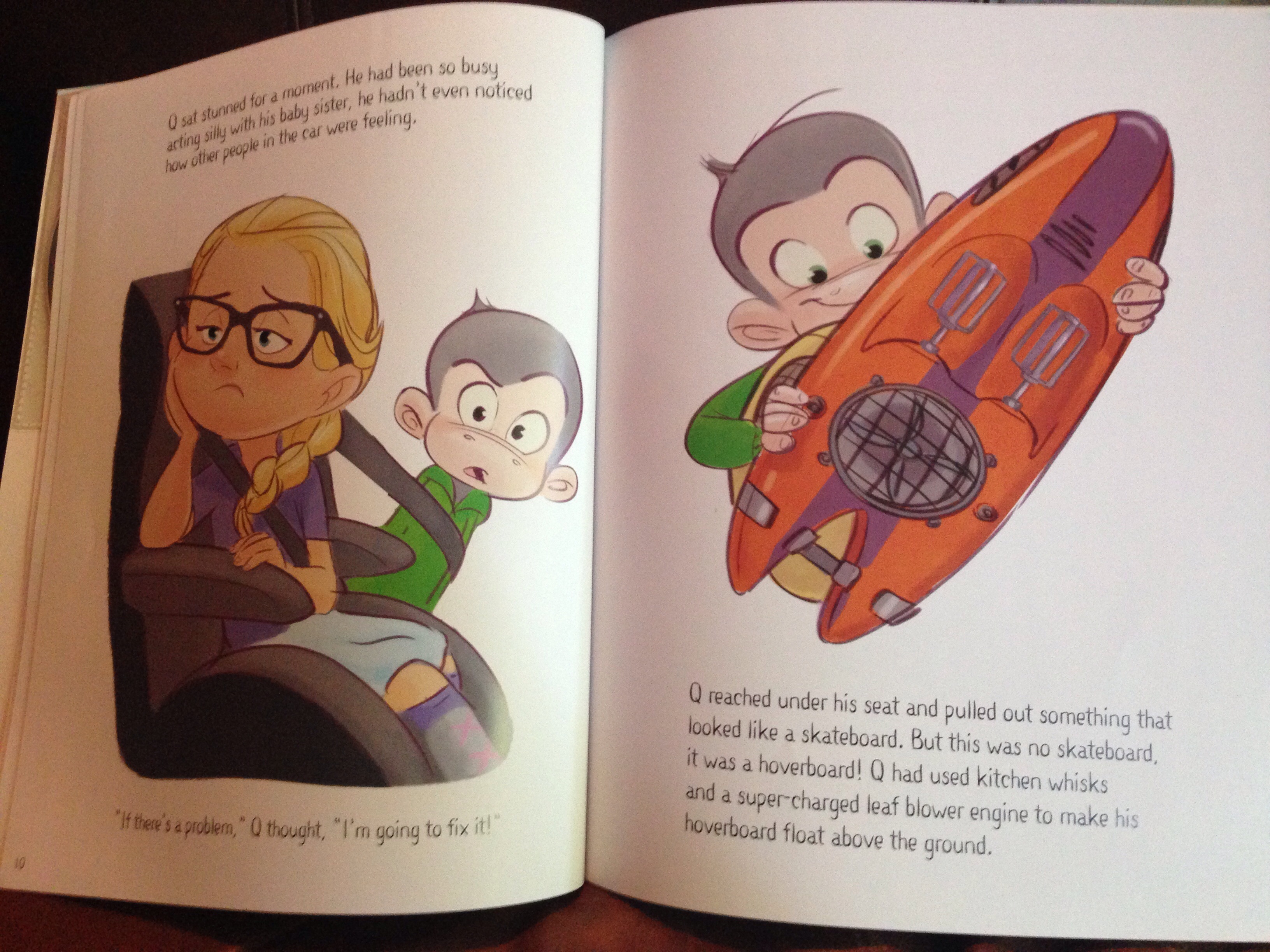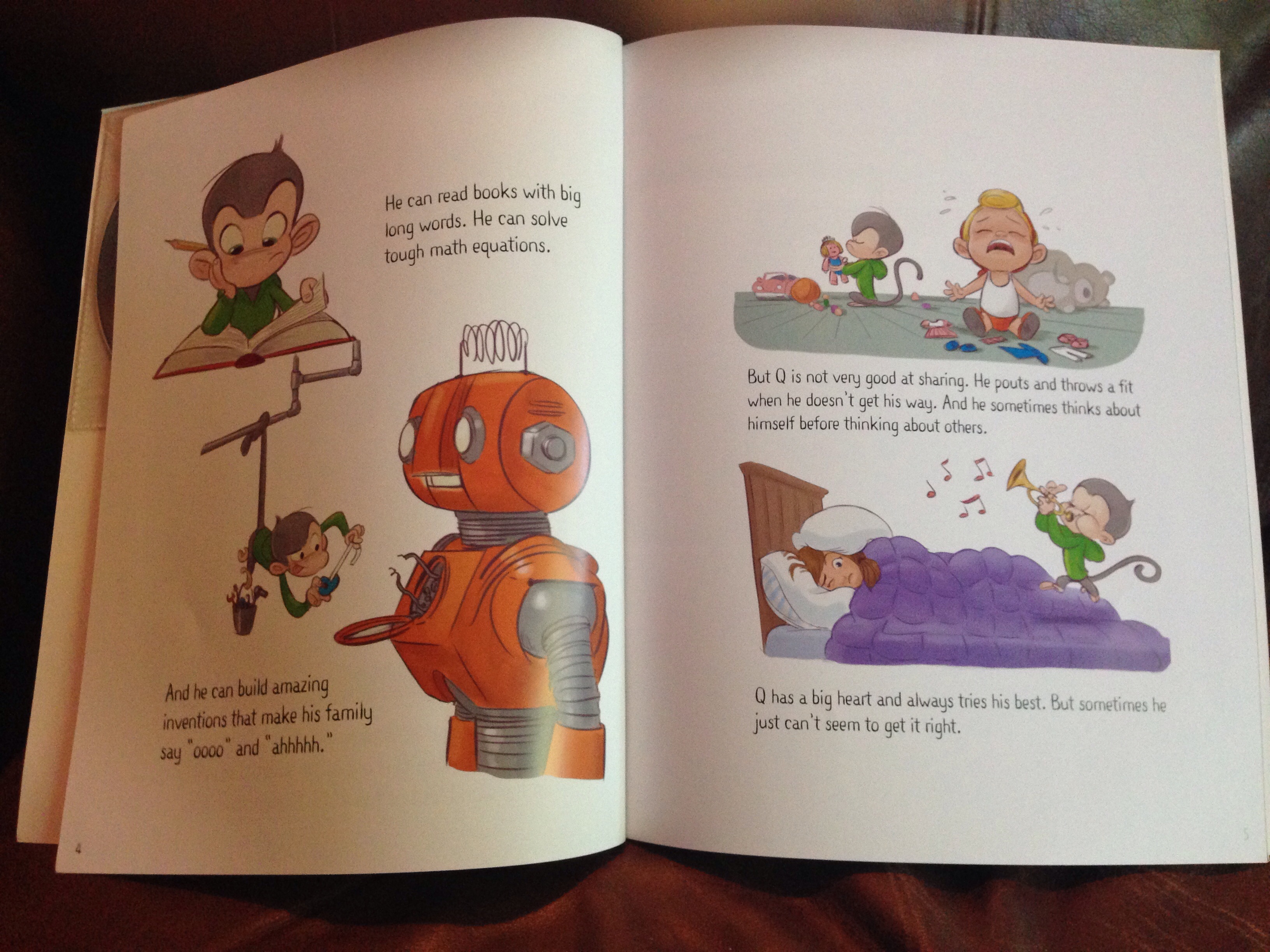The Q’s Wild Ride book included with the game is fun to read to introduce kids to the loveable yet quirky character Q before playing the game. (Q is “a dusky leaf monkey”…. thanks for including the specifics! The first question my patient with ASD asked was “what kind of monkey is that?”). The Read-Along Storybook & CD is exactly the same story but in a larger book format and includes a CD with two tracks (with and without page turn signals). The narration and sound effects are very well done in the CD and the illustrations in the book depict emotions well through exaggerated facial expressions and body language. I took a couple of pics of interior pages since none seemed to be available online and this will help folks make purchasing decisions.