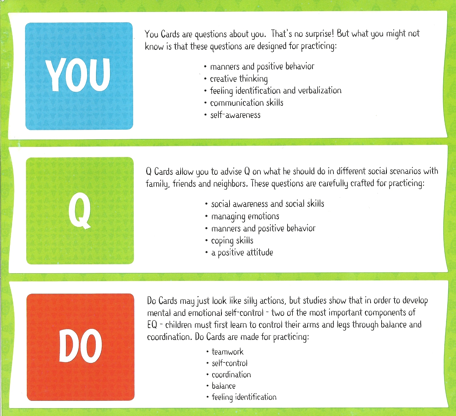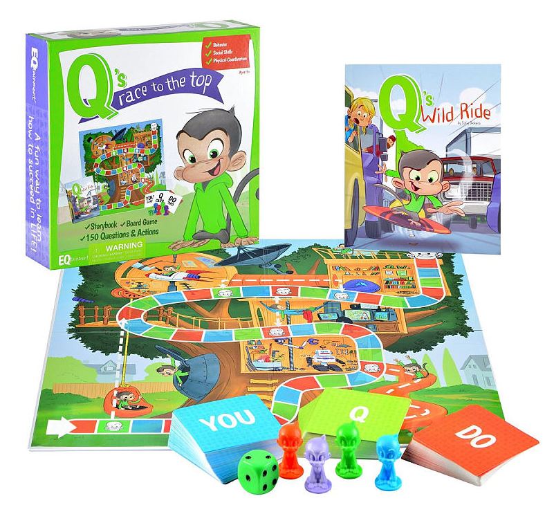 I am SUPER excited to have these amazing products to use in OMazing Kids speech-language therapy and kids yoga classes! EQtainment generously sent me the Q Toys Bundle to try out and review. They have been a HUGE hit with my patients. The bundle includes the Q’s Race to the Top Boardgame, Q’s Race on the Go Pack, Q’s Wild Ride Read-Along Storybook & CD, Q’s Coloring & Activity Book, and the Q-Time Buddy weighted plush doll. [price: $59.99 (an $8.00 savings over purchasing all of the items separately): http://shop.eqtainment.com/products/q-toys-bundle].
