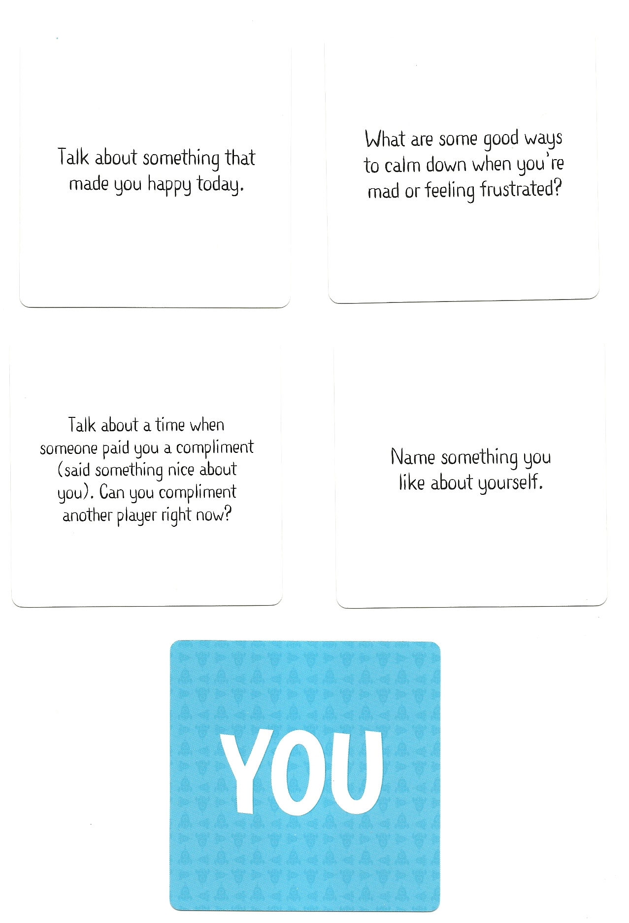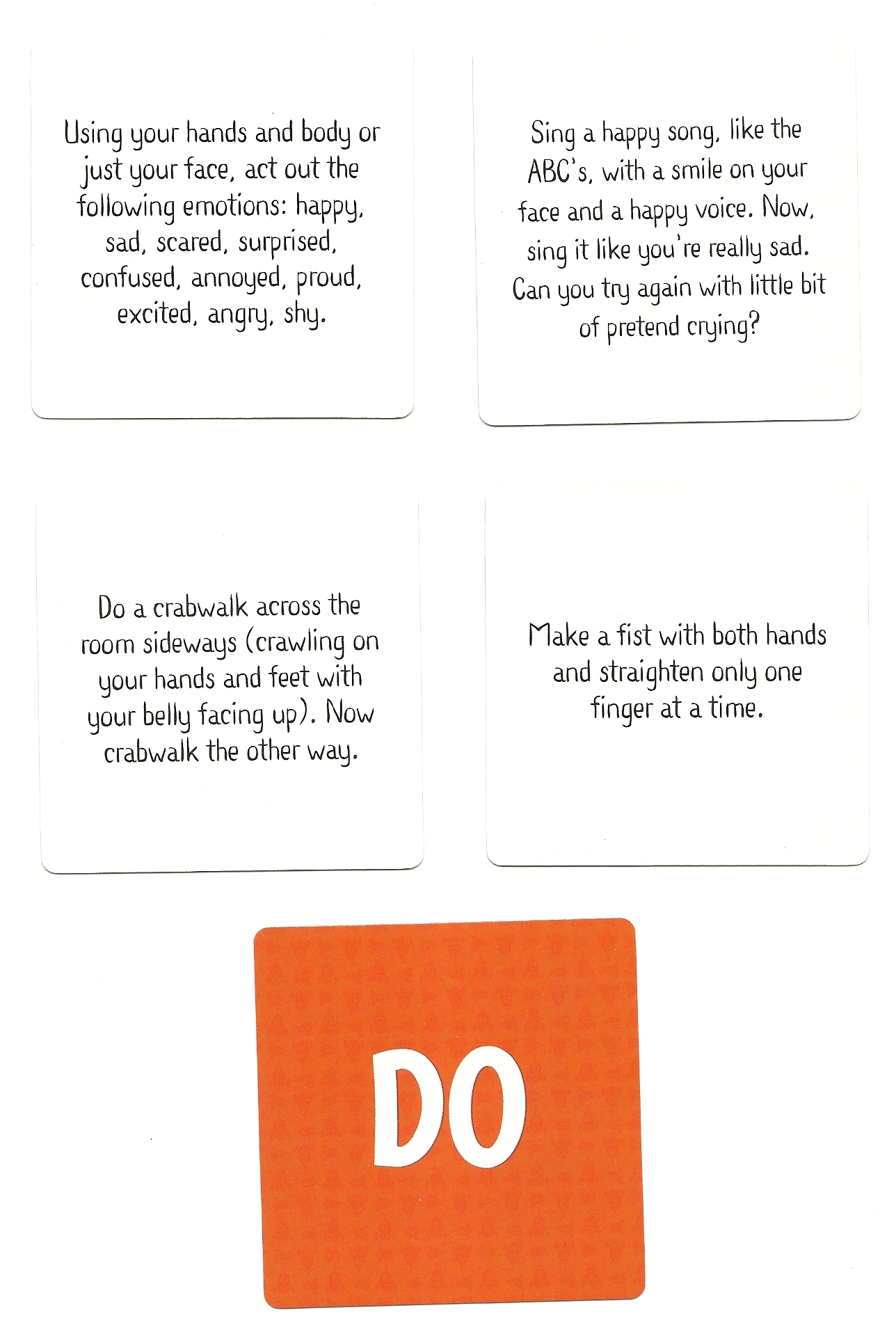 The cards in the game have a wide degree of difficulty and social skills targeted. The game was designed and tested with kids ages 3-12 years old. Younger kids or those with special needs may need the therapist or parent to preselect cards before the start of the game to best suit their kids needs. The adult could also simplify the wording as they read the cards. The “Do” cards contain a mix of physical actions ranging from simple to pretty challenging. Some also incorporate emotions and facial expressions. Again I would suggest preselecting the ones that will best suit your kids physical abilities and developmental level. The adult may need to simplify these activities or modify them for kids with special needs. For kids that need a visual support to help them understand what the motion would look like, I will incorporate video modeling and pictures. The selfie camera mode on my iPad will also come in handy.