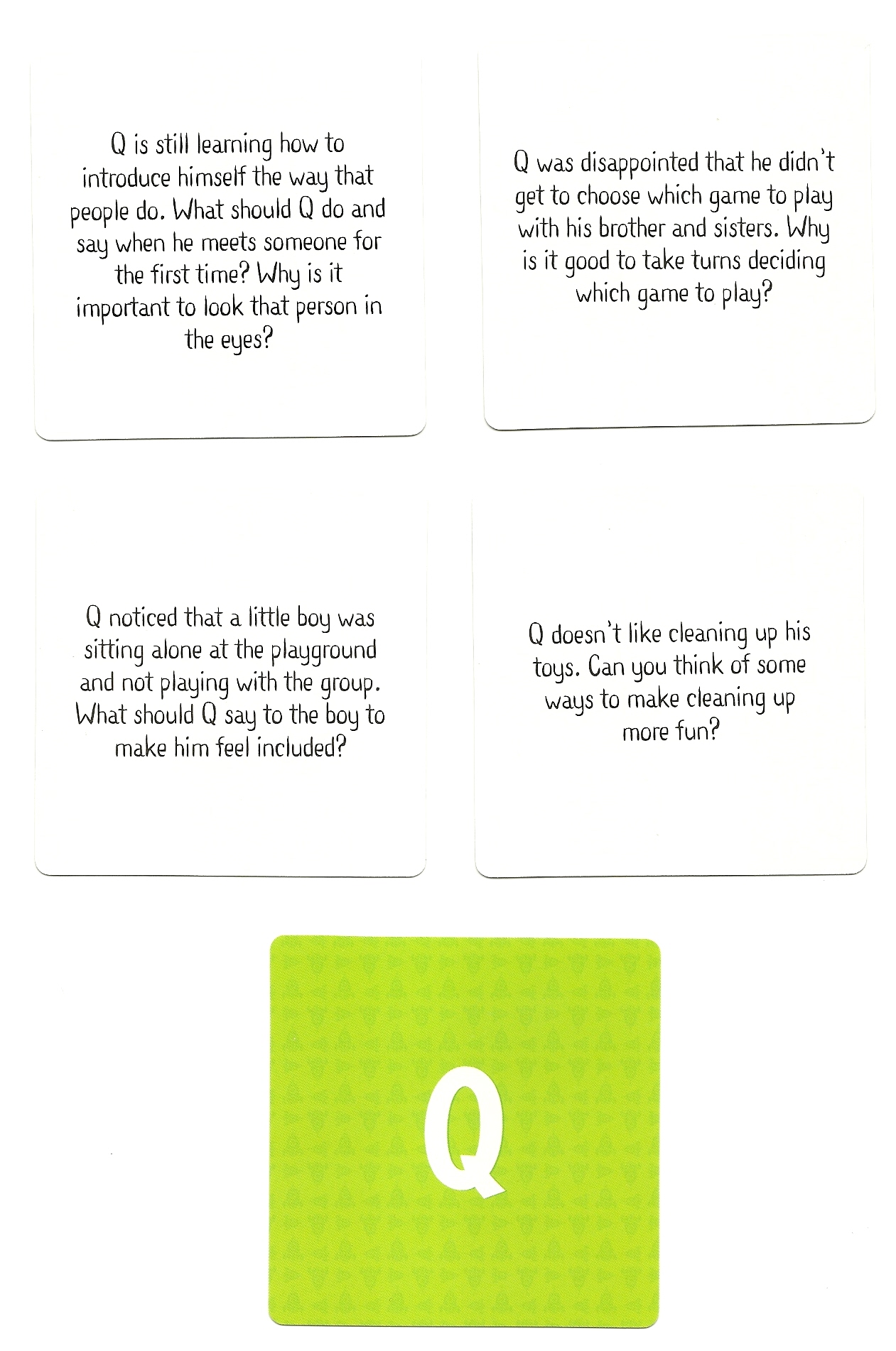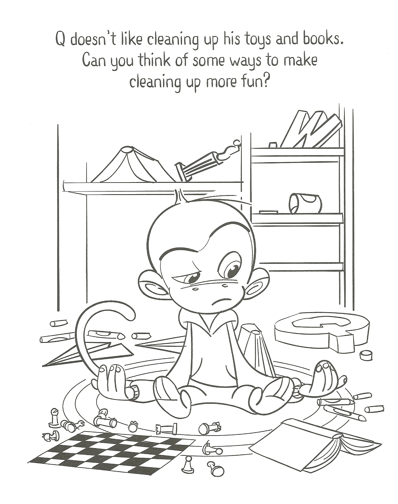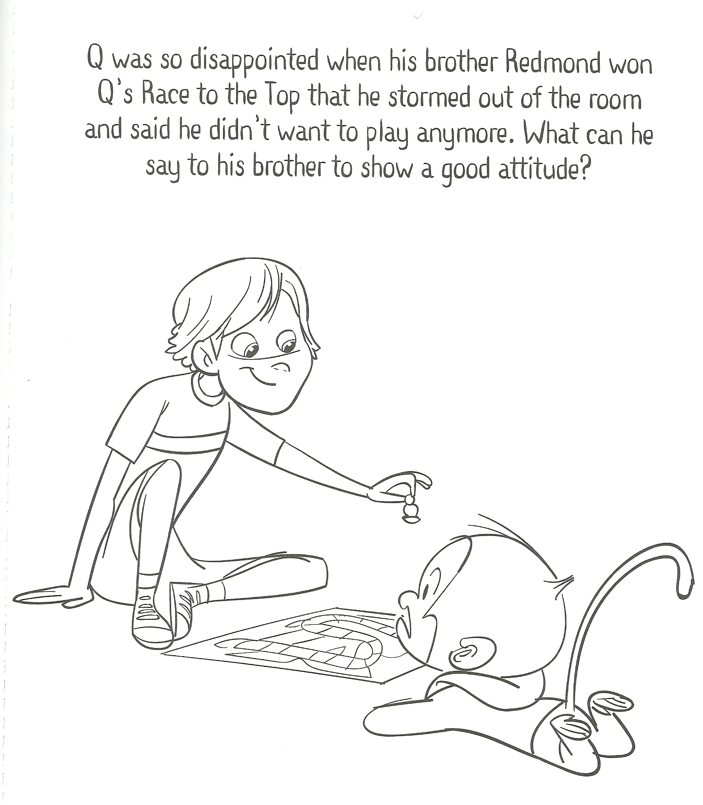The Q’s Coloring &Â Activity Book is filled with great tie-ins to the book & game. It also includes several pages that are unique to just the coloring book and also includes fun activity pages (dot-to-dot, finish the picture, maze, find the same, drawing emotions on faces, etc…). I scanned a couple of interior pages since none seemed to be available online and this will help folks make purchasing decisions.