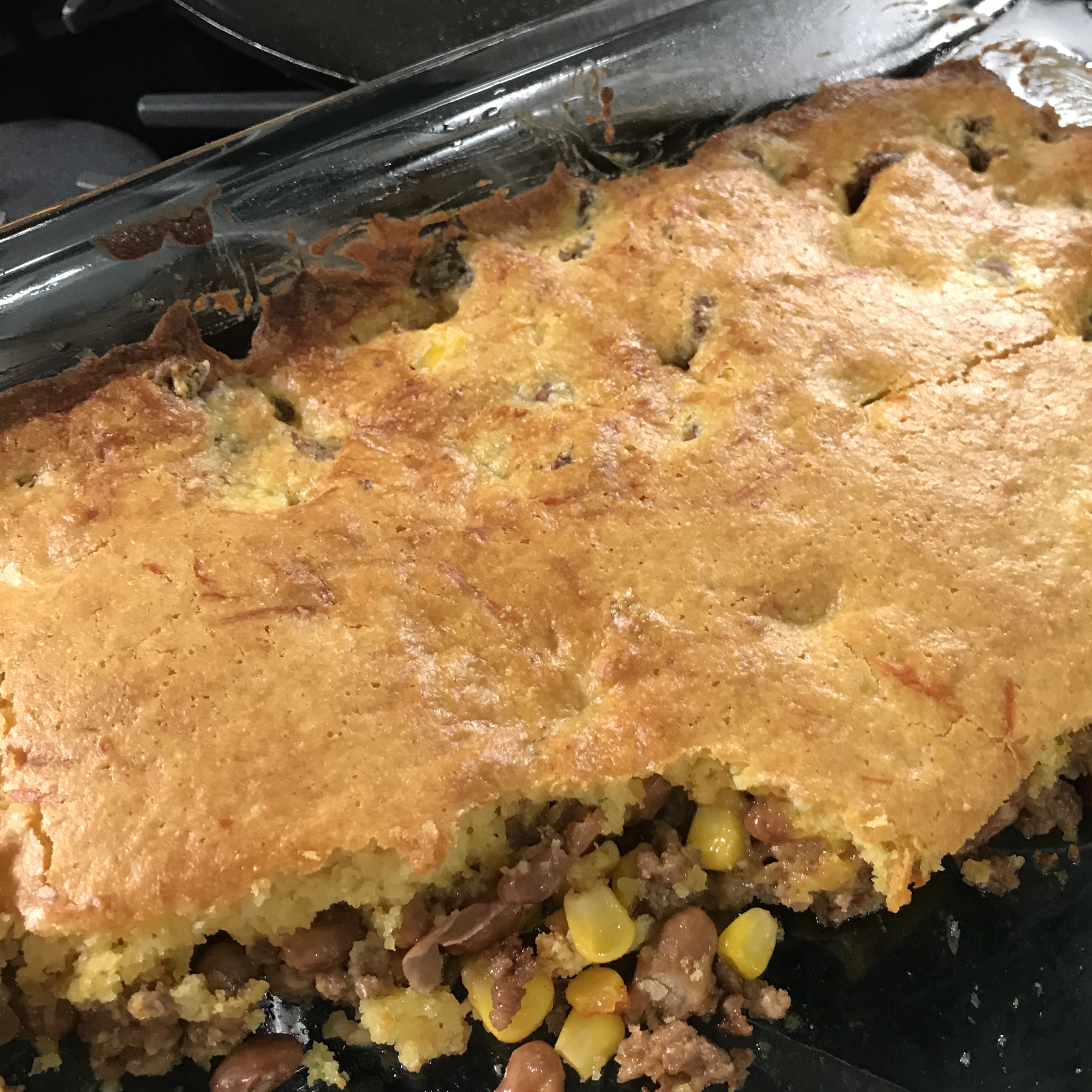 - Gently spread the cornbread to the edges of the pan, evening it out over the top of the casserole.
