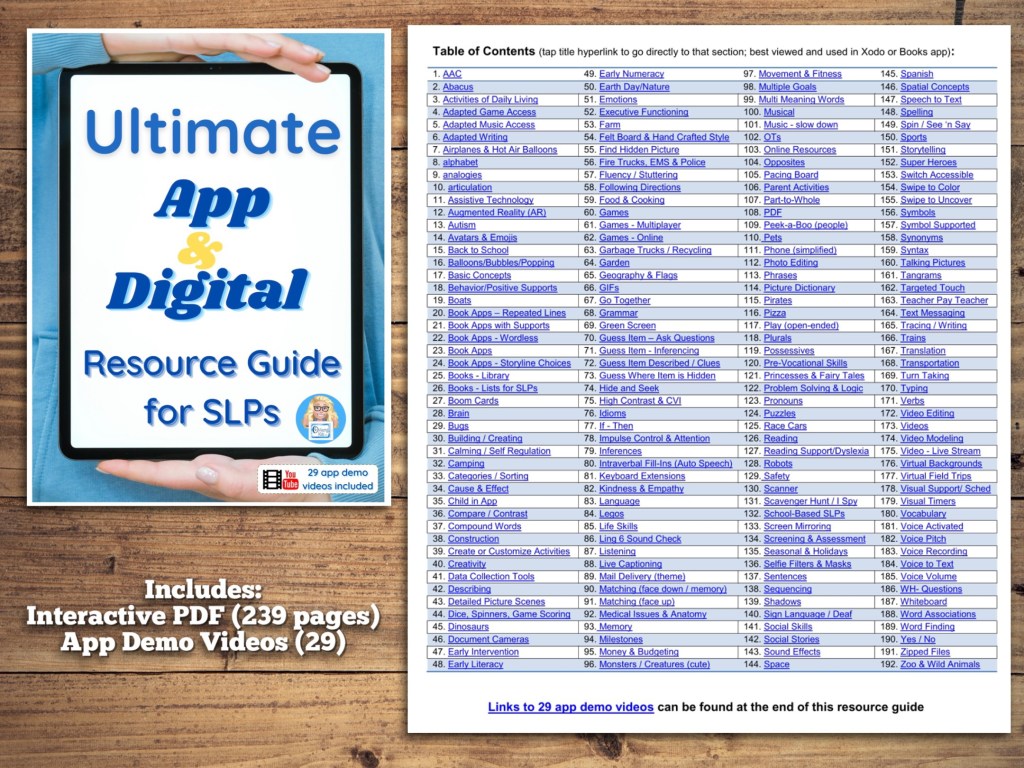 Want info about hundreds of apps and digital resources at your fingertips? Check out this brand new item on my TPT store: Ultimate App and Digital Resource Guide for SLPs, https://www.teacherspayteachers.com/Product/Ultimate-App-and-Digital-Resource-Guide-for-SLPs-7267356.