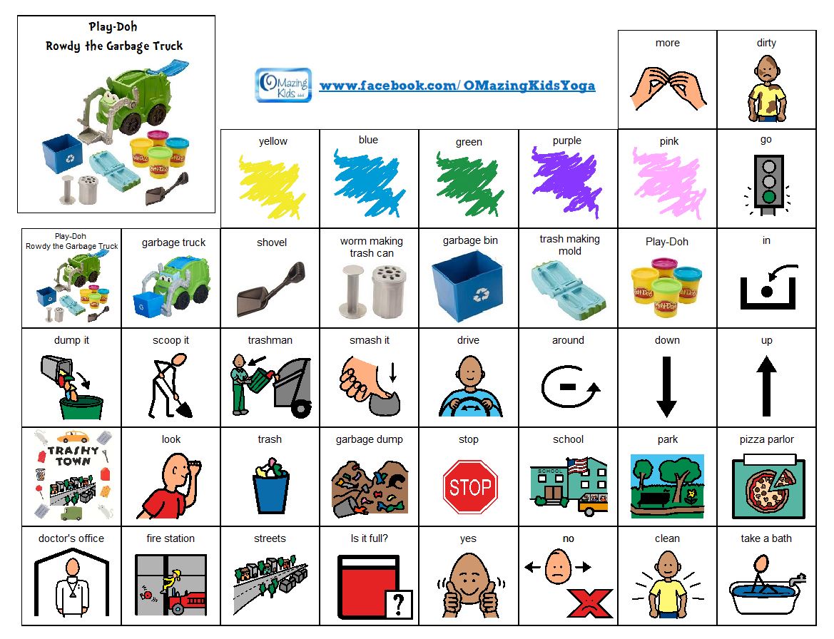 No-Prep “Grab & Go” Activity for Core Vocabulary & Language: Play-Doh Rowdy the Garbage Truck and the book Trashy Town (includes free printable symbols and coloring page)