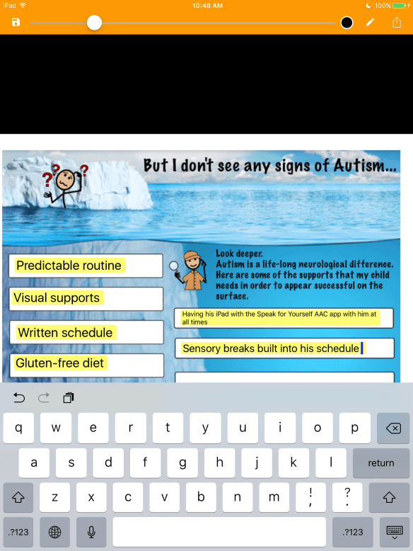 Example of me filling it out on SnapType (not specific to any particular child… just examples based on commonly occurring supports). After you are finished you can save it and export as a picture, as a PDF or as a SnapType file to share via e-mail or text message. The yellow highlighting only shows up while you are completing it… not in what you share.