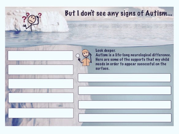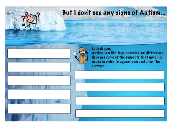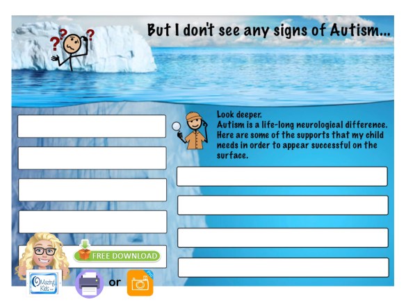 If you want to print and fill out by writing in the boxes, there are three versions in this PDF (full color, faded color and black/white) so you can choose the one that best fits your printing needs: Autism Iceberg – Supports Needed for My Child to Appear Successful (free printable from Angela Moorad, MS, CCC-SLP at OMazing Kids)