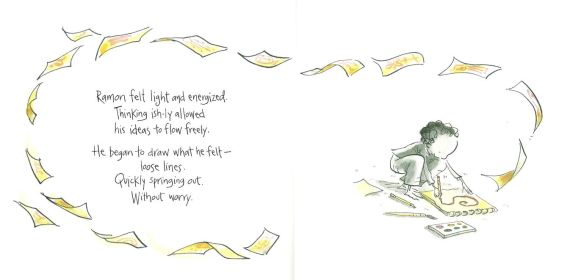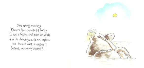 • Ish by Peter H. Reynolds [Follow the little boy inspired by Vashti in the book “The Dot”. Drawing is what Ramon does. It’s what makes him happy. But in one split second, all that changes. A single reckless remark by Ramon’s older brother turns his carefree sketches into joyless struggles. Luckily his little sister, Marisol, sees the world differently. She opens his eyes to something a lot more valuable than getting things just “right.” The power of “-ish”. Opportunities for kids yoga or creative movement: lay on tummy, bed, “Ewww” breath (painting by trash cans), chair, flower, tense/relax fists (like crumpling paper), stomping feet (I’m done!), standing forward fold (as Marisol picks up a crumpled drawing), Toe-ga (to pick up small crumped balls of paper), stretch up & side to side as Marisol tapes the drawing in the gallery on her wall, gyan mudra looking glasses, ish-poses (make up “ish” variations on poses: tree, house, boat, fish & sun and the poses that make them “feel” peace-ish, silly-ish & excited-ish …. if time allows keep the creative ish-pose process going. Kids could work in pairs – one creates a pose, the other draws it (and of course signs it like in The Dot) & then trade roles. Their art could be copied so the whole group could have a set of yoga-ish pose cards), poem / journaling, mindfulness activities to experience savoring the moment; plus lots of opportunity for discussion of the power of our words to discourage or encourage others.]