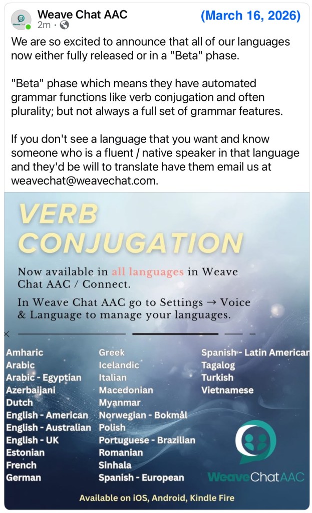 As of 3/16/26, Weave Chat AAC is fully available in English (English USA, English UK & English Australia). The following additional languages are available in “Beta” phase (it has verb conjunction but is still under development): Amharic, Arabic (Modern Standard Arabic & Egyptian Dialect), Azerbaijani, Dutch, Estonian, French, German, Greek, Icelandic, Italian, Macedonian, Myanmar (Burmese), Norwegian, Polish, Portuguese (Brazilian), Romanian, Sinhala, Spanish (Spain & Latin American), Tagalog (Filipino), Turkish, Vietnamese.