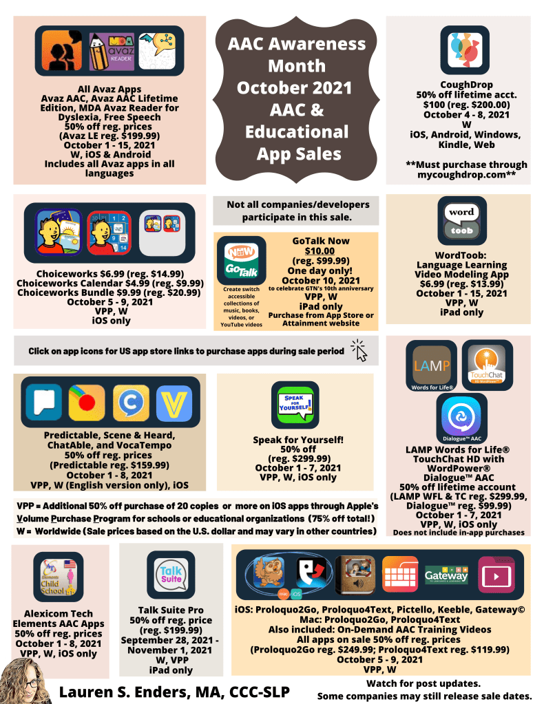 See this roundup post from Lauren Enders Gonzales, MA, CCC – SLP about all of the AAC app sales this month: https://m.facebook.com/story.php?story_fbid=2941267676011196&id=178231088981549