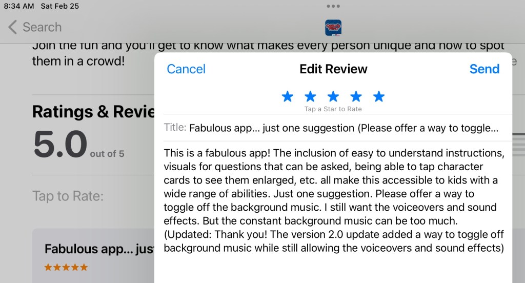 So excited that they incorporated my feedback! The 2.0 update added a way to toggle off the background music while still allowing the voiceovers and sound effects. I just a submitted an update for my review to say “thanks” ⬇️