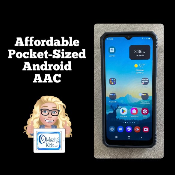 Looking for an affordable option for pocket-sized AAC? Many users prefer to just add an app to their iPhone or Android phone but some settings don’t allow phones (or it would be a battle to get an exception). The iPod Touch used to be my “go to” option for this. Since the iPod Touch was discontinued I purchased an Android Samsung Galaxy A03s (prepaid TracFone that has NOT been activated for cellular service) on Amazon. Shout out to Karen Erickson for sharing that idea in a comment in the AAC for the SLP group. It was only $59.88 and essentially gives me an Android equivalent to an iPod Touch (which Apple has discontinued) for pocket-sized AAC. I added a $12.99 case that has a tiny ring stand and sliding cover for the camera. So for $72.87 (+ the cost of the app) I have a very affordable pocket-sized AAC device.