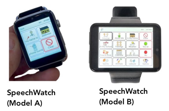 SpeechWatch with TalkTablet Pro: I don’t typically recommend the TalkTablet app since it’s not very intuitive to use but wanted to include their watches in this post for those who might watch to research them further. I have no idea how well these work and am not sure what type of watch was used to build them (it’s not an Apple Watch): https://usaspeechtablets.com/products/swa & a much larger one: https://usaspeechtablets.com/products/swb
