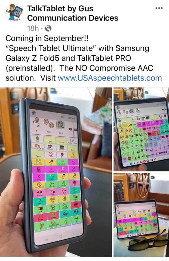 Updated 8/13/23: They just announced a new option on the Samsung Galaxy Fold5 foldable phone/tablet. Looks cool but very pricey and they don’t offer an option for funding via insurance / Medicaid. Very few folks would be able to afford the base model ($3,000) even if divided into monthly payments. https://usaspeechtablets.com/products/speech-tablet-ultimate-package-includes-the-new-samsung-foldable-phone-tablet-protective-case-stand-and-talktablet-pro-preinstalled