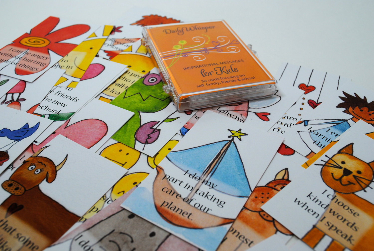 The Daily Whisper cards include affirmations about choices kids have control over (ex: I am always nice to my friends. I am kind to myself. I choose kind words when I speak. I am kind to everyone in my family. I am kind to all living creatures. I am considerate of other people feelings. I help my parents with work around the house., etc….), affirmations relating to difficult situations kids commonly face (ex: I don’t let bullies bother me, if they do I tell an adult I can trust. I know that some kids won’t like me and that’s okay. It is okay to fail sometimes, that just means I need to learn more and try again. I can be angry without hurting people of things. , etc….), affirmations that inspire kids to work hard & have confidence (ex: I try my best and don’t give up. I am proud of who I am and all that I have learned. I stay focused on my projects. I enjoy learning new things. I can be great when I put my mind to it. I am confident in myself. I am patient with myself as I learn new things. etc….) and affirmations that inspire feelings of love (ex: I am loved and very loveable. I am very important to my family. I am happy to be me., etc….).