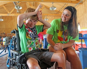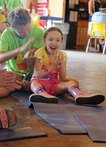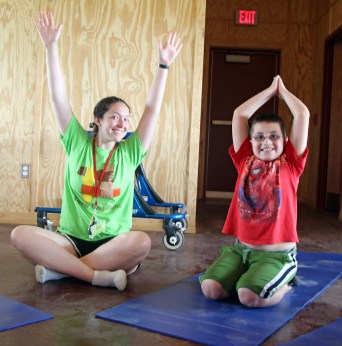 Ok on to what we did in yoga…. This child is doing the pose for the pirate ship mast (a seated version of mountain pose with hands up and together for a tall, straight mast). It made my heart smile to see him using his iPad to tell his outpatient PT at JDMC that he wanted to go back to camp this week 🙂