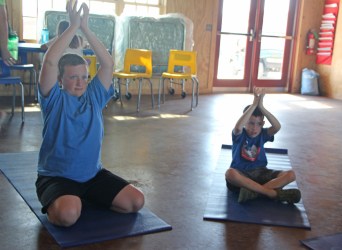 Week 1 of Camp ClapHans at the JD McCarty Center primarily had kids with ADHD. After reading through the campers registration forms, I knew that my usual “storybook” approach to yoga would not be the best choice for the older group of boys at camp that week. So I jumped out of my comfort zone & planned some freestyle yoga storytelling with a little structure based on the Monkey Mind Pirates workbook & CD. As I was setting up, I overheard the boys commenting “yoga is for girls”, “I don’t like yoga”, “Do we have to?”. Fearing a mutiny, I calmed & centered myself with yoga breathing & listening to a few tunes from my playlist as I continued setting up. When I set out the Hoberman Sphere & the Vibratone, two of the boys were drawn like moths to a flame. {Ahhhh….. the magic of yoga props!}. Before I knew it, the rest of the boys were seated on mats intrigued by what we were going to do.