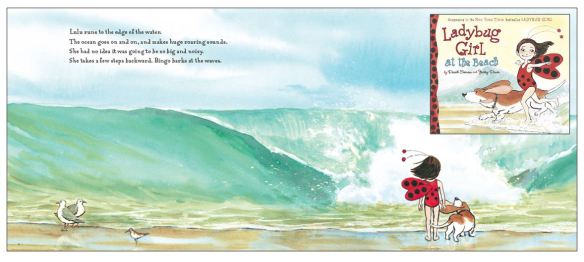Ladybug Girl looking out at the big waves in the ocean through the Gyan Mudra binoculars (FYI…. this is not the child I was describing above. She was one of the other campers. It made my heart smile to see how well she already knew how to do yoga! When she saw the seagull in the book she spontaneously went into Pigeon Pose….. one that I have a difficult time getting into myself.)